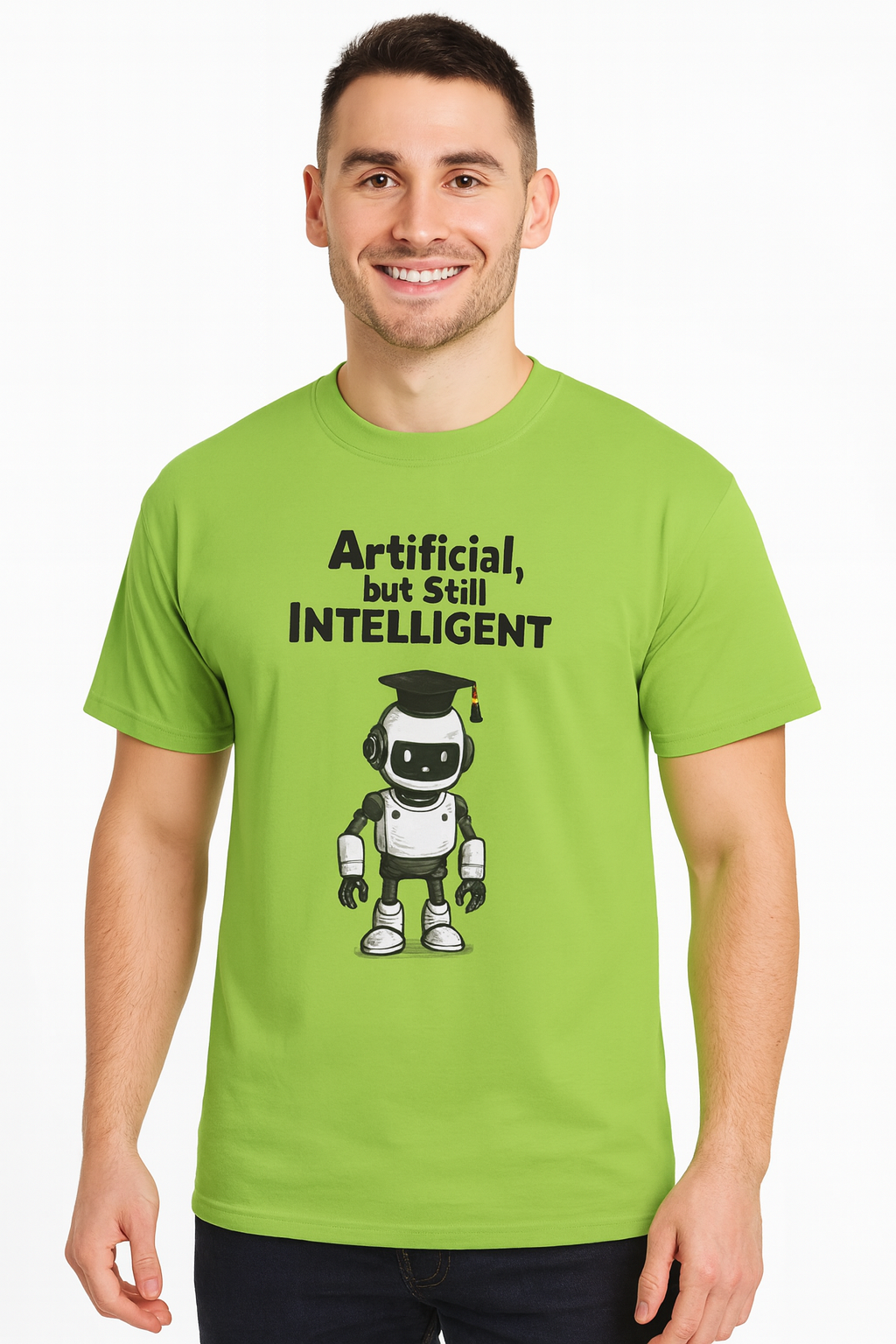 This clever tee pairs classic robot charm with academic flair, featuring a proud little bot in a graduation cap under the bold declaration: Artificial, but Still Intelligent. Whether you’re into AI, computer science, or just a fan of smart humour, this shirt is your new favorite geek-chic go-to.