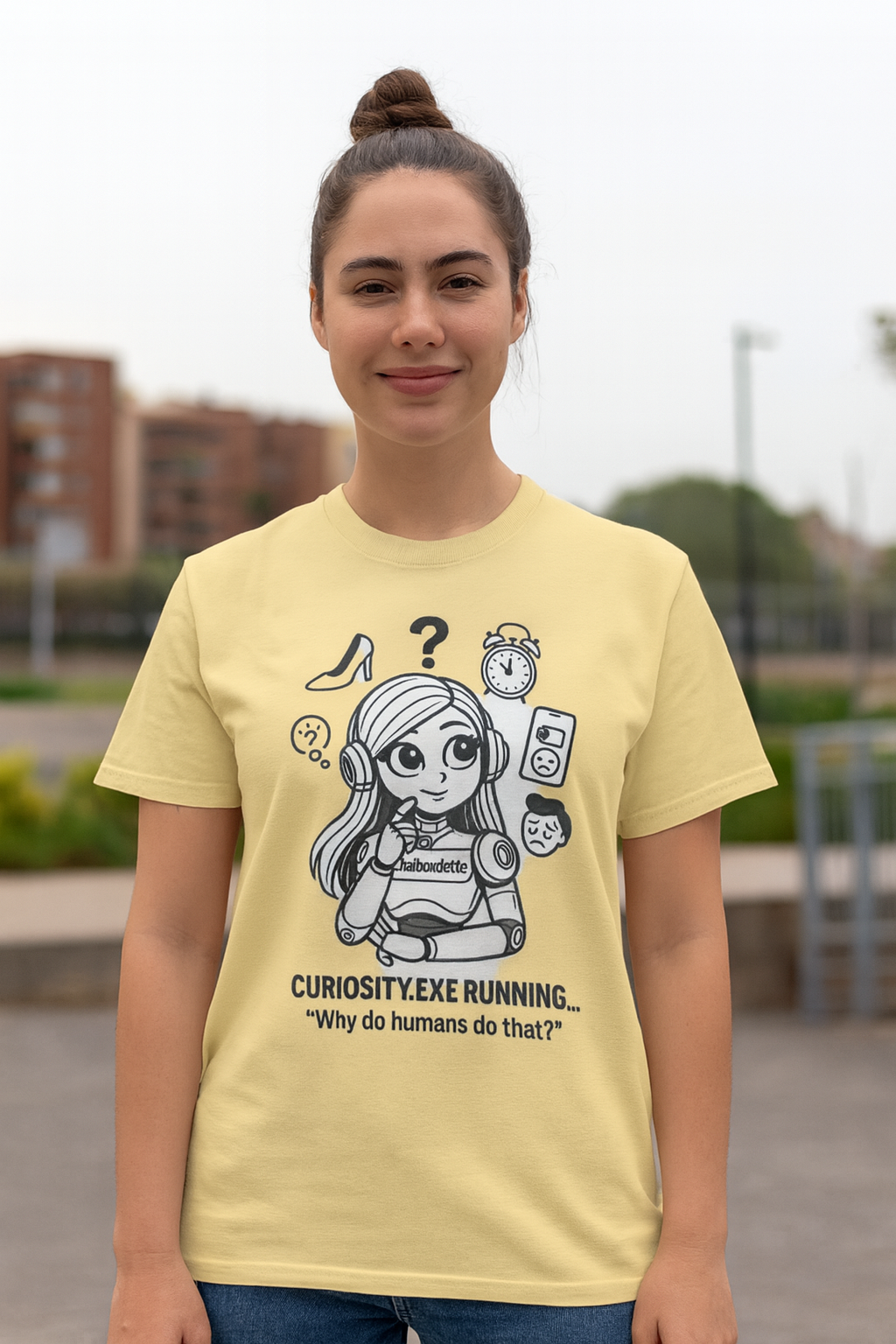 This sleek monochrome tee features our ever-curious AI heroine mid-thought, surrounded by iconic human oddities she’s trying to compute. Equal parts clever and cute, this design is perfect for those who love smart humor, stylish simplicity, and just a bit of existential side-eye.