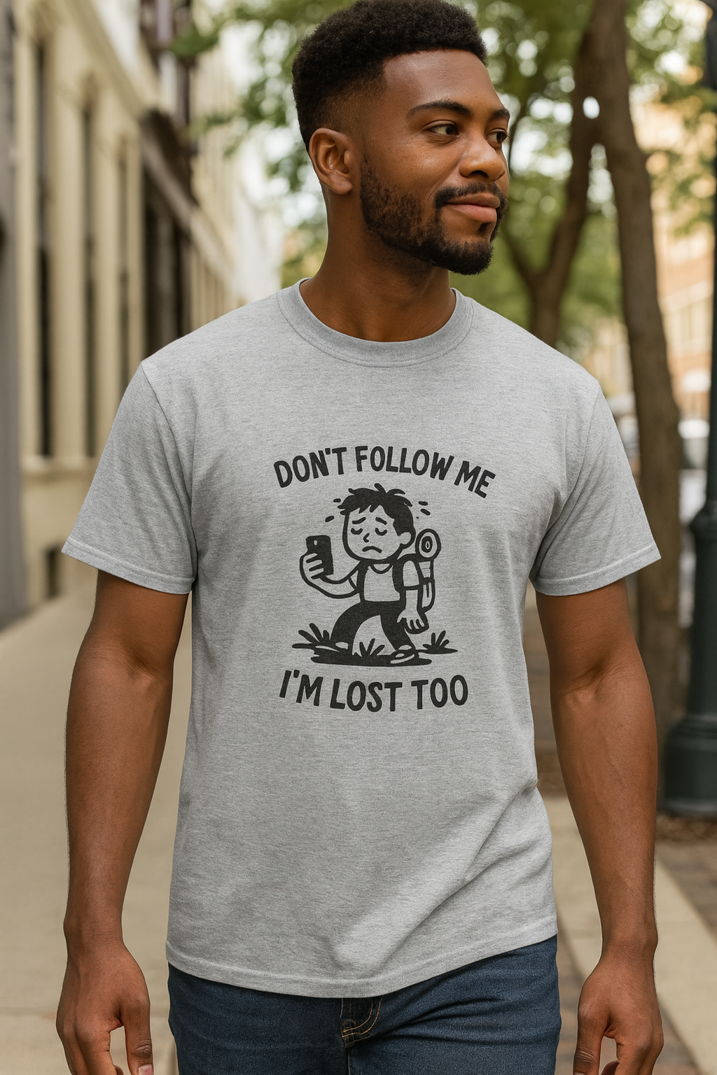 Lost? Same. This "Don’t Follow Me, I’m Lost Too" t-shirt is perfect for hikers, campers, road-trippers—or anyone who’s just winging it through life. Featuring a hilariously relatable graphic of a confused adventurer glued to their phone, this tee delivers laughs and comfort in equal measure.