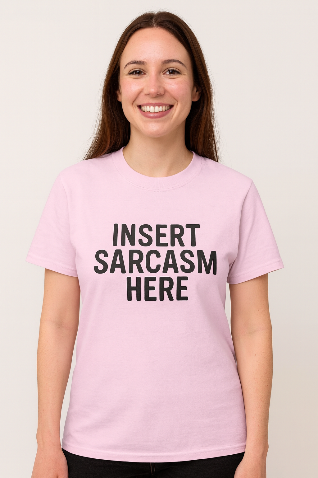Let your T-shirt do the talking with this brilliantly blunt “Insert Sarcasm Here” design. Clean, classic, and loaded with dry wit, this tee is perfect for lovers of deadpan humor and sharp one-liners. Whether you’re navigating awkward meetings, family gatherings, or just a Tuesday, this shirt silently delivers the sass so you don’t have to. Made with soft, breathable fabric and a comfortable unisex fit, it’s your new go-to for casual wear with a sarcastic twist. Great as a gift or a personal mood signal—because let’s face it, sarcasm is your second language.