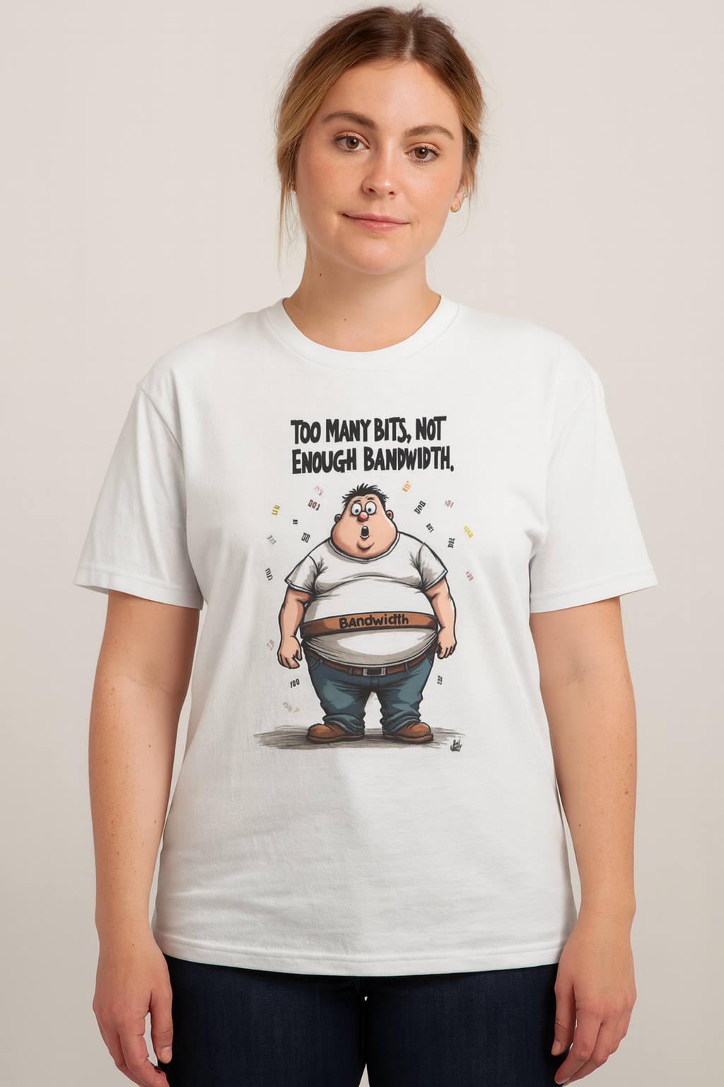 This hilarious tee features a wide-eyed, cartoon guy whose "Bandwidth" belt is doing its best to hold the line. Surrounded by a flurry of flying binary bits, he’s the perfect symbol of data overload.
