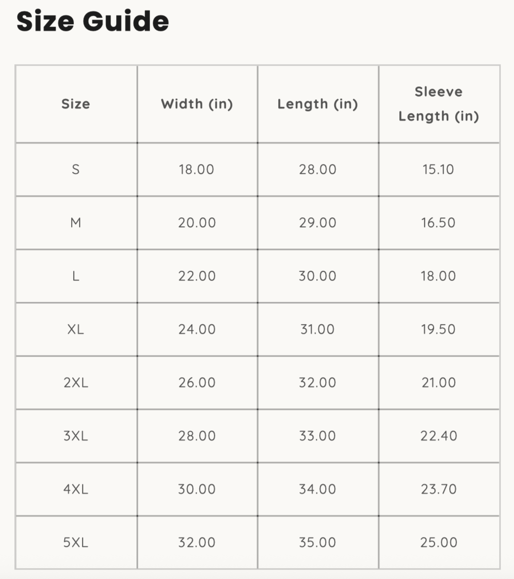 | Size | Width (in) | Length (in) | Sleeve Length (in) |