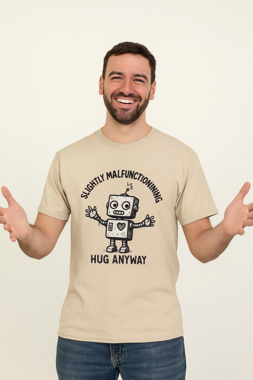 Slightly malfunctioning? Aren’t we all. This unisex robot tee is for the overthinkers, the awkward huggers, and anyone who’s ever glitched mid-sentence. Featuring our adorably frazzled bot and the reminder to “Hug Anyway,” it’s the perfect blend of techie humor and heartfelt charm.
