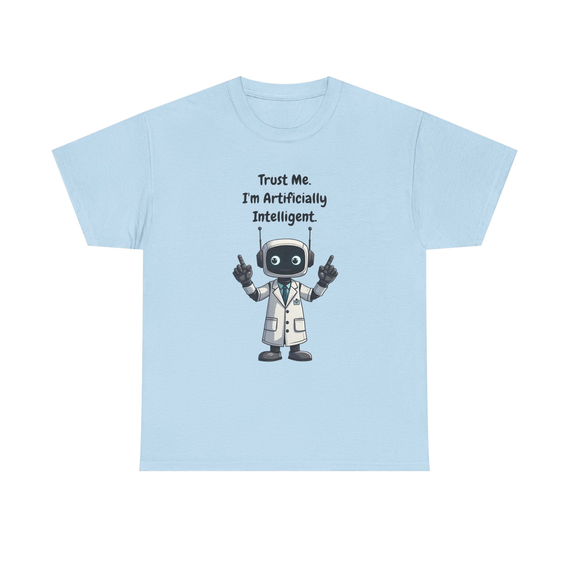 Upgrade your wardrobe with this cheeky, tech-savvy tee featuring our charming AI bot in a lab coat and the phrase: "Trust Me, I’m Artificially Intelligent." Whether you're a coding genius, a science lover, or just someone who appreciates clever wordplay, this shirt brings brains and style together in one sleek design.